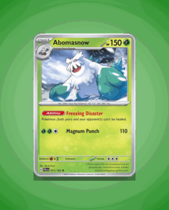 Abomasnow, hailing from the Paldea Evolved set, is a rare find with an impressive HP of 150. This icy Pokémon’s signature attack, Magnum Punch, packs a powerful punch. With the ability Freezing Disaster, it can create a chilly effect on the battlefield.