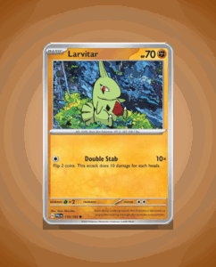 Larvitar, the Rock-type Pokémon, makes its debut in the Paldea Evolved set with an unassuming Common rarity. With 70 HP, this burrowing baby dinosaur is a modest addition to any collection, but don’t underestimate its Double Stab attack potential. Despite not having a listed ability…