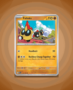 In the vibrant world of Paldea Evolved, Falinks (#119) stands tall as a common find among collectors. This resilient Pokémon boasts a robust HP of 110, ready to withstand the fiercest battles. Its unique attack, Reckless Charge Together, is a testament to its aggressive nature…