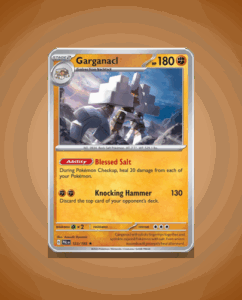 In the vibrant world of Paldea Evolved, the towering Garganacl takes center stage with its Rare status. Boasting a robust HP of 180, this colossal Pokémon is ready to unleash its powerful Knocking Hammer attack. Its unique ability, Blessed Salt, adds an extra layer of…