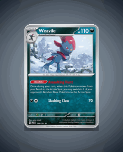 In the expansive Paldea Evolved set, the elusive Weavile (#134) emerges as a rare find. This enigmatic Pokémon boasts an impressive 110 HP and is equipped with the formidable Assaulting Hunt ability. Its signature move, Slashing Claw, is a testament to its razor-sharp claws that…