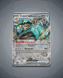 In the expansive Paldea Evolved set, Copperajah ex stands out as a Double Rare treasure, boasting an impressive HP of 300. This imposing Pokémon’s unique ability, Bronze Body, is sure to captivate collectors and strategists alike. Its signature attack, Nosequake, promises an intriguing gameplay experience…