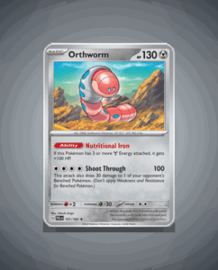 In the vibrant world of Paldea Evolved, the rare Orthworm stands out with its striking 130 HP. This burrowing Pokémon boasts the unique ability, Nutritional Iron, and is ready to unleash the powerful Shoot Through attack. Collectors will be thrilled to find this impressive creature…
