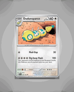 In the vibrant world of Paldea Evolved, Uncommon Pokémon Dudunsparce (#157) emerges with an impressive 140 HP. Its signature attack, Dig Away Flash, adds a dynamic edge to any battlefield. Despite its absence in the ability field, the enigma surrounding this peculiar spiky creature only…