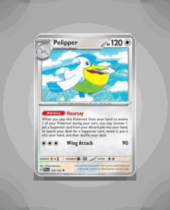 In the vibrant world of Paldea’s Evolved set, the Uncommon Pokémon Pelipper (#159) takes flight with a mighty 120 HP. Known for its unique ability, Hearsay, this water-flying type is ready to swoop in and deliver a powerful Wing Attack.