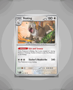 Slaking, the number 162 in the Paldea Evolved set, is a rare find among collectors. This formidable Pokémon boasts an impressive HP of 180, making it a sturdy addition to any deck. Its unique ability, Stir and Snooze, can potentially put opponents’ Pokémon to sleep…