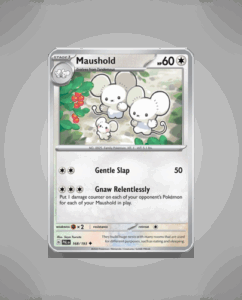 In the vibrant world of Paldea Evolved, the uncommon Maushold (#168) makes its debut. This adorable Pokémon boasts an impressive HP stat of 60, ready to withstand battles ahead. Its signature move, Gentle Slap, is a testament to its gentle nature, making it a unique…