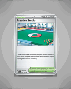 In the vibrant world of Paldea Evolved, the Uncommon Pokémon card, Practice Studio (#186), takes center stage. This agile and enigmatic Pokémon, with no specified HP or ability, is ready to join your deck. While its attack power remains undisclosed, collectors eagerly anticipate the impact…