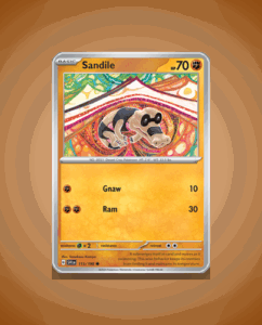 Sandile, the tenacious desert dweller, makes its debut in the Scarlet Violet set with the number 115. As a Common Pokémon, it boasts a robust HP of 70 and an attack named Ram. Despite not having an ability listed yet, this resilient Ground-type is ready…