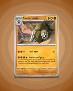 In the expansive Scarlet Violet set, the Uncommon Pokémon Sandaconda (#120) emerges with a commanding presence, boasting a robust HP stat of 140. Its signature attack, Skull Bash, is a powerful display of its might. Despite the absence of an explicitly stated ability, the enigma…