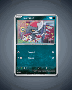 In the vibrant world of Scarlet Violet, a new common addition graces the Pokémon Trading Card Game: Pawniard, number 132. This steely-gray sword dancer boasts an impressive 70 HP and is equipped with the piercing attack, ready to strike fear into any opponent on the…