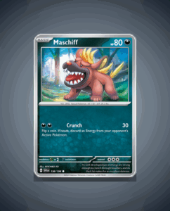 In the vibrant world of Scarlet Violet, prepare to welcome Maschiff, a robust Common Pokémon with a striking appearance. As the 136th card in this set, Maschiff boasts an impressive Health Point total of 80. Its primary attack, Crunch, is a force to be reckoned…