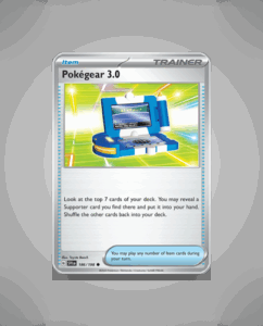 The Pokégear 3.0, debuting in the Scarlet Violet set as card number 186, is a common find among collectors. This versatile device, though lacking HP, boasts no specific attack or ability, making it an accessible addition to any Trainer’s collection.