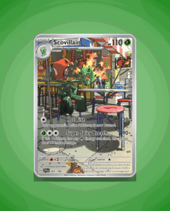 In the fiery expansion of Scarlet Violet, a new Illustration Rare Pokémon emerges – the Scovillain (#202). With an impressive HP of 110, this spicy creature is ready to unleash its Super Spicy Breath attack on unsuspecting opponents. Although its ability remains a mystery for…