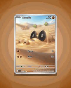 In the vibrant world of Scarlet Violet, the Illustration Rare Sandile makes its grand entrance as number 216. This tenacious Ground-type Pokémon boasts an impressive HP of 70, ready to withstand the fiercest battles. Its signature attack, Ram, is a force to be reckoned with…