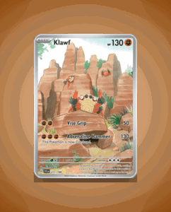In the vibrant world of Scarlet Violet, prepare to meet Klawf, the Illustration Rare Pokémon that towers with an impressive HP of 130. This imposing Ground-type Pokémon is a force to be reckoned with, wielding the powerful attack “Adrenaline Hammer”. While its ability remains undisclosed…