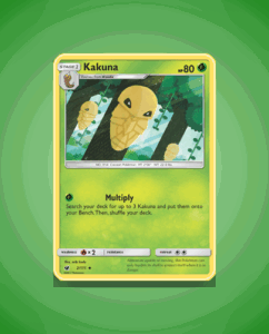 Kakuna from the Crimson Invasion set is an Uncommon card with 80 HP. This sturdy Pokémon features the attack Multiply, adding strategic value to gameplay. Its sleek design complements the vibrant theme of the set.