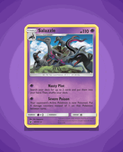 Salazzle is a Rare Holo card from the Crimson Invasion set, numbered 47. It boasts 110 HP and features the attack Nasty Plot. This sleek Pokémon adds a distinctive flair to any collection.