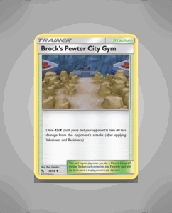 Brock’s Pewter City Gym is an uncommon card from the Hidden Fates set, numbered 54. This card captures the essence of the iconic gym leader’s challenge in a vivid way. Its design reflects the sturdy, rock-solid theme associated with Pewter City.