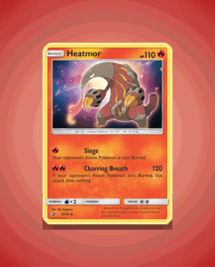 Heatmor from the Dragon Majesty set is an uncommon card numbered 10. This fiery Pokémon boasts 110 HP and features the dynamic attack Charring Breath. Its vibrant design captures the essence of its blazing nature.