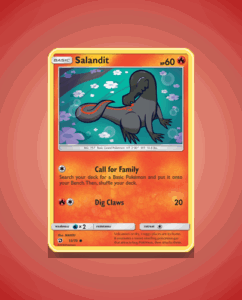 Salazzle from the Dragon Majesty set is an uncommon card numbered 14. It features 110 HP and a striking Flamethrower attack. This sleek Pokémon adds a fiery edge to any collection.