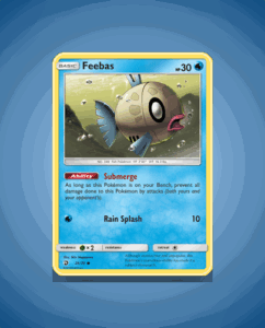 Feebas from the Dragon Majesty set is a common Pokémon card numbered 28. It has a modest 30 HP and features the ability Submerge, alongside the attack Rain Splash. This card offers a simple yet distinct presence in any collection.