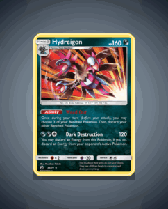 Hydreigon from the Dragon Majesty set is a Rare Holo card numbered 33. This striking Pokémon boasts 160 HP and features the ability Weed Out, enhancing strategic play. Its powerful attack, Dark Destruction, adds to its dynamic presence in battle.
