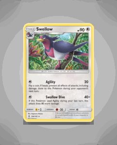 Swellow from the Guardians Rising set is a Rare card numbered 104 with 90 HP. It features the attack Swallow Dive, showcasing its swift aerial prowess. This card offers a dynamic addition to any collection.
