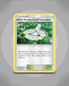 Aether Paradise Conservation Area is an Uncommon card from the Guardians Rising set, numbered 116. This card captures a serene location within the Pokémon world, offering a glimpse into the tranquil habitats preserved for Pokémon. Its detailed artwork complements the theme of conservation and care.