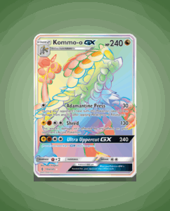 Kommo-o-GX from the Guardians Rising set is a Rare Rainbow card boasting a robust 240 HP. This striking card features the powerful attack Ultra Uppercut-GX, making it a notable addition to any collection. Its vibrant design stands out among other cards in the series.