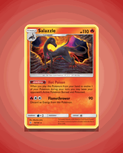 Salazzle from the Guardians Rising set is a rare Pokémon card numbered 16. It features 110 HP and the ability Hot Poison, adding strategic depth. Its attack, Flamethrower, offers a fiery option for battles.