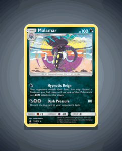 Malamar from the Unbroken Bonds set is a Rare Holo card numbered 119. It features 100 HP and a striking attack called Dark Pressure. This card offers a sleek addition to any collection with its distinctive design.