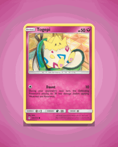 Togepi from the Unbroken Bonds set is a charming Common card numbered 136. It has 50 HP and features the attack Daunt. This modestly powered card fits well in beginner decks or as a collectible for fans of the series.