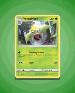 Weepinbell from the Unbroken Bonds set is an uncommon Pokémon card with 80 HP. This lively card features the straightforward attack Ram. Its design captures the energetic spirit of Weepinbell in battle.