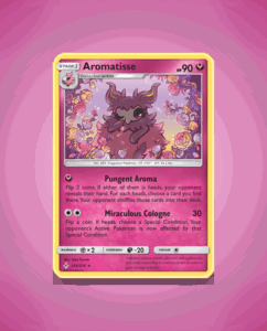 Aromatisse from the Unbroken Bonds set is a Rare card numbered 142 with 90 HP. This Pokémon features the vibrant attack Miraculous Cologne. Its design and abilities make it a distinctive addition to any collection.
