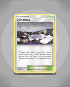 Dust Island is an uncommon card from the Unbroken Bonds set, numbered 168. Its design captures a mysterious and rugged atmosphere, fitting the set’s adventurous theme. This card adds intriguing variety for collectors seeking unique locations within the series.