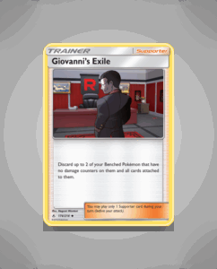 Giovanni’s Exile is an Uncommon card from the Unbroken Bonds set, numbered 174. This card features a striking design that captures the intense atmosphere of its theme. It holds a unique place in the set despite lacking attacks or abilities. Collectors appreciate its distinct visual…