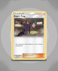 Koga’s Trap is an Uncommon Trainer card from the Unbroken Bonds set, numbered 177. This card adds strategic depth to gameplay with its unique effect. Collectors will find it a notable piece within the Unbroken Bonds collection.