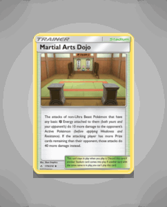 Martial Arts Dojo is an Uncommon Trainer card from the Unbroken Bonds set, numbered 179. This card adds strategic depth to gameplay with its unique effects. Collectors will appreciate its role within the set’s dynamic lineup.