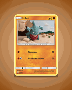 Gible from the Unified Minds set is a common card numbered 112. This lively Pokémon has 60 HP and features the attack Headbutt Bounce. Its straightforward design makes it a charming addition to any collection.