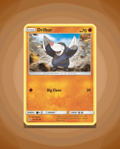 Drilbur from the Unified Minds set is a common card numbered 118. This Pokémon has 70 HP and features the straightforward attack Dig Claws. Its design captures the energetic nature of Drilbur with a clean, simple layout.