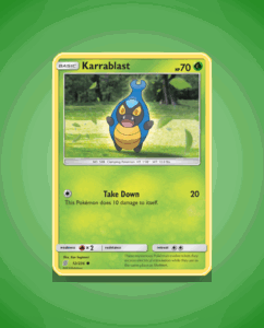 Karrablast from the Unified Minds set is a Common Pokémon card with 70 HP. It features the straightforward attack Take Down, making it a solid choice for basic gameplay. This lively bug-type adds a splash of energy to any collection.
