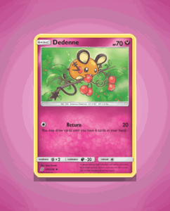 Dedenne from the Unified Minds set is an uncommon Pokémon card with 70 HP. It features the attack Return, offering a straightforward gameplay option. This compact card fits neatly into many decks for a balanced approach.