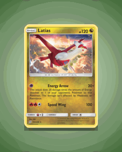Latias from the Unified Minds set is a Rare card boasting 120 HP. This sleek Pokémon features the attack Speed Wing, adding dynamic potential to gameplay. Numbered 153, it stands out in any collection.