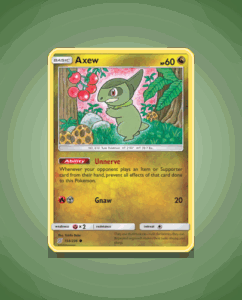 Axew is a Common Pokémon from the Unified Minds set, numbered 154. It has 60 HP and features the ability Unnerve, which can disrupt an opponent’s strategy. Its attack, Gnaw, offers a straightforward offensive option. This card provides a solid addition for collectors focusing on…