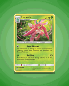 Lurantis is an Uncommon Pokémon from the Unified Minds set, numbered 16. It has 110 HP and features the attack Sol Slice. This vibrant card adds a fresh option for players seeking balanced power and durability.