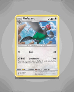 Unfezant from the Unified Minds set is a rare card featuring 140 HP. It boasts the striking attack Downburst, adding dynamic play potential. Numbered 176, this card stands out in any collection.