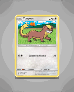 Yungoos is a Common Pokémon from the Unified Minds set, numbered 180. It has 70 HP and features the attack Cavernous Chomp. This modest card offers straightforward gameplay for collectors and players alike.