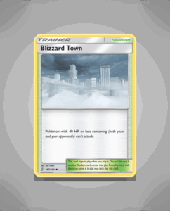 Blizzard Town is an Uncommon card from the Unified Minds set, numbered 187. Its design captures a chilly, wintry scene that fits well within the set’s diverse themes. This card offers collectors a unique glimpse into the frosty environments featured in the Pokémon TCG.