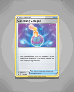 Canceling Cologne is an Uncommon card from the Astral Radiance set, numbered 136. Its design adds a subtle strategic element to any deck. This card is a distinctive piece for collectors seeking variety within the set.